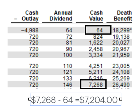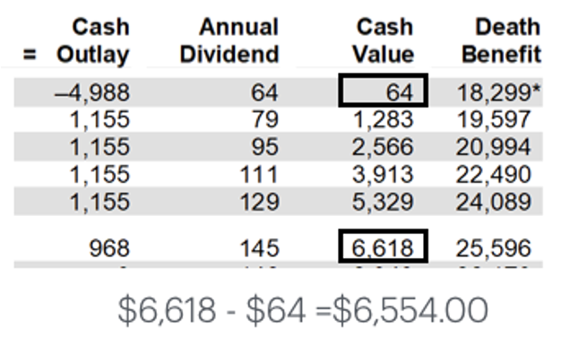When you borrow $4,988 from an Insurance Company, leveraging your participating whole life insurance, and repay it at 5% over 5 years, you will pay $5,588 not $5,760.50 because the compounding growth of the policy is helping you repay this policy loan. The compounding growth will also provide another $966 of cash value, meaning you will have $6,554 of additional cash value from the time you took your $4,988 policy loan. This is like earning a 6.34% return on the loan payments you made back to the Insurance Company.